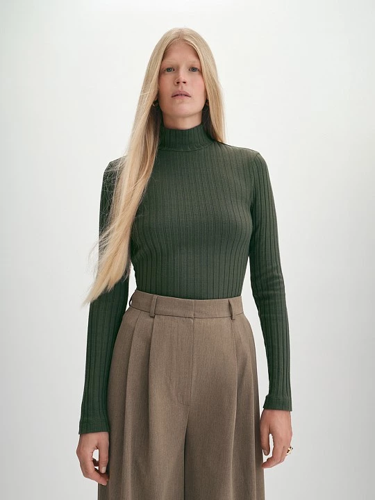 Облегающий тонкий джемпер с горлом, средним по высоте воротником-стойкой и втачным длинным рукавом. Выбрали для базового гольфа фактурный трикотаж "в рубчик". Кроеный трикотаж отличается особой эластичностью и мягкостью благодаря высокому содержанию нейлона, характеризуется гигроскопичностью (хорошо впитывает воду) и высокими показателями воздухопроницаемости – за это спасибо вискозе. Полиэстер же отвечает за продление срока службы и возможность долго носить модель из такой ткани под верхнюю одежду. Водолазка в насыщенном зеленом будет востребована как офисная, школьная, повседневная.