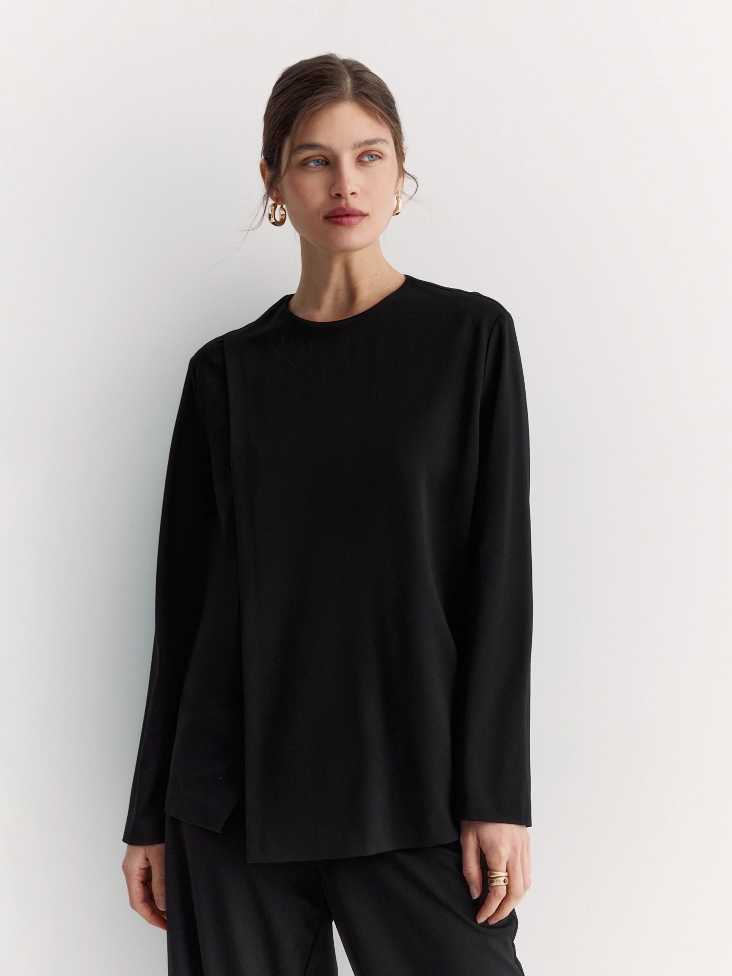Модель сшита из вискозного трикотажа с добавлением нейлона и эластана — такая ткань прекрасно держит форму, обладает комфортной эластичностью и не требует сложного ухода. Классический черный цвет подойдет для базовых сочетаний.