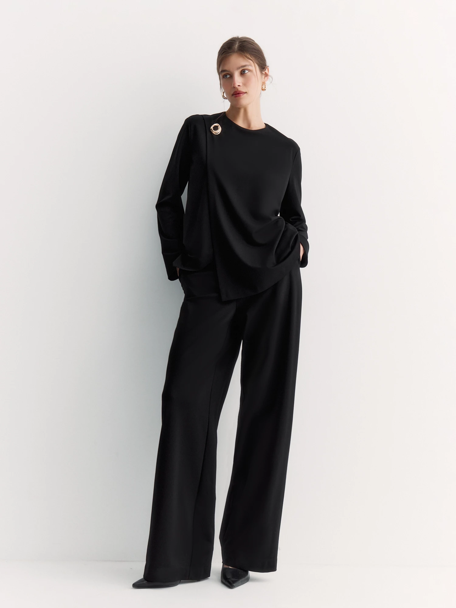 Брюки прямые, широкие, невероятно комфортные. Удобный притачной пояс без шлевок дополнен резинкой по спинке, он комфортно сидит и не сковывает движения. Застежка сбоку на потайную молнию аккуратна и практична. По бокам — косые карманы, куда можно спрятать телефон или ключи.