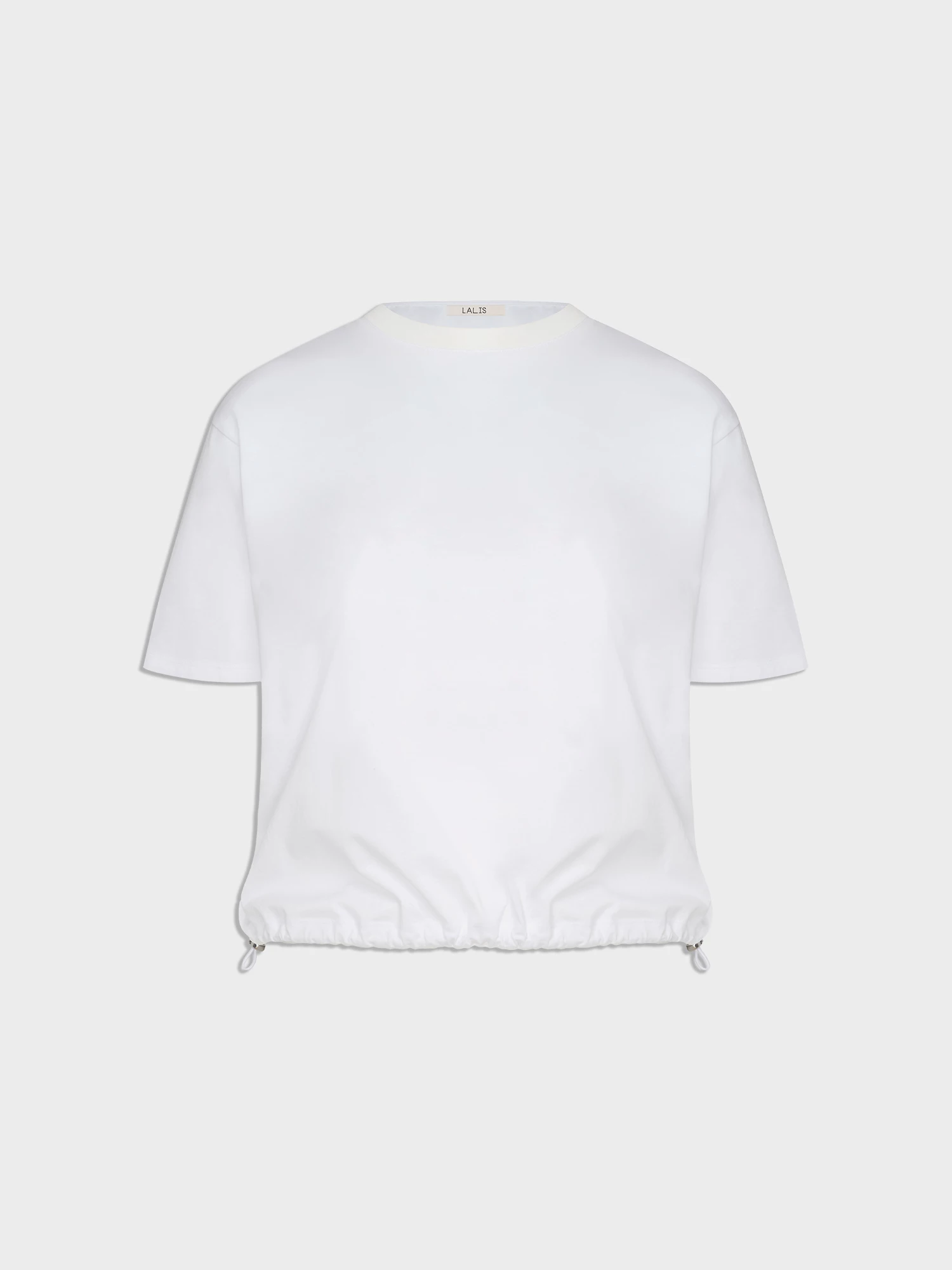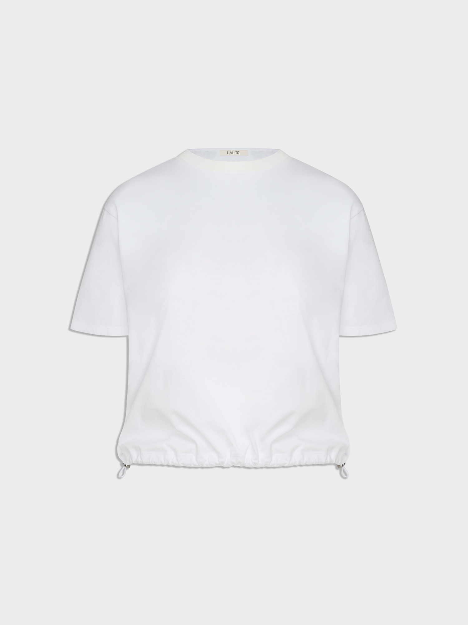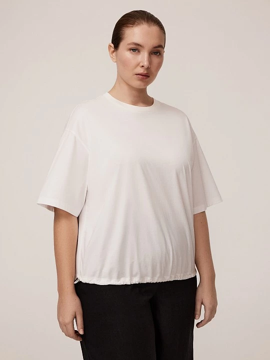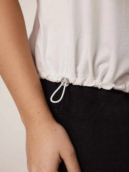 Мягкий премиальный хлопок подарит коже ощущение особого комфорта, позволяя свободно дышать даже в самый жаркий день. Воздухопроницаемая структура натурального волокна обеспечивает идеальную терморегуляцию, гипоаллергенные свойства делают эту вещь безопасной даже для самой чувствительной кожи, а белый цвет обладает практичным свойством отражать солнечные лучи. Эластичный трикотаж «рибана» не только придает интересную текстуру, но и надежно держит форму выреза горловины, что наделяет модель длительным сроком службы. Аккуратный втачной рукав обеспечивает комфортную посадку, не стесняя движений, а спущенный плечевой шов смягчает линии. Кулиса на резинке с фиксаторами по низу изделия формирует модный О-образный силуэт, добавляя образу современности и легкости, в то время как минималистичный дизайн позволяет создавать десятки образов — от офисных луков с классическими и кэжуальными юбками и брюками до расслабленных ансамблей с джинсами или шортами.