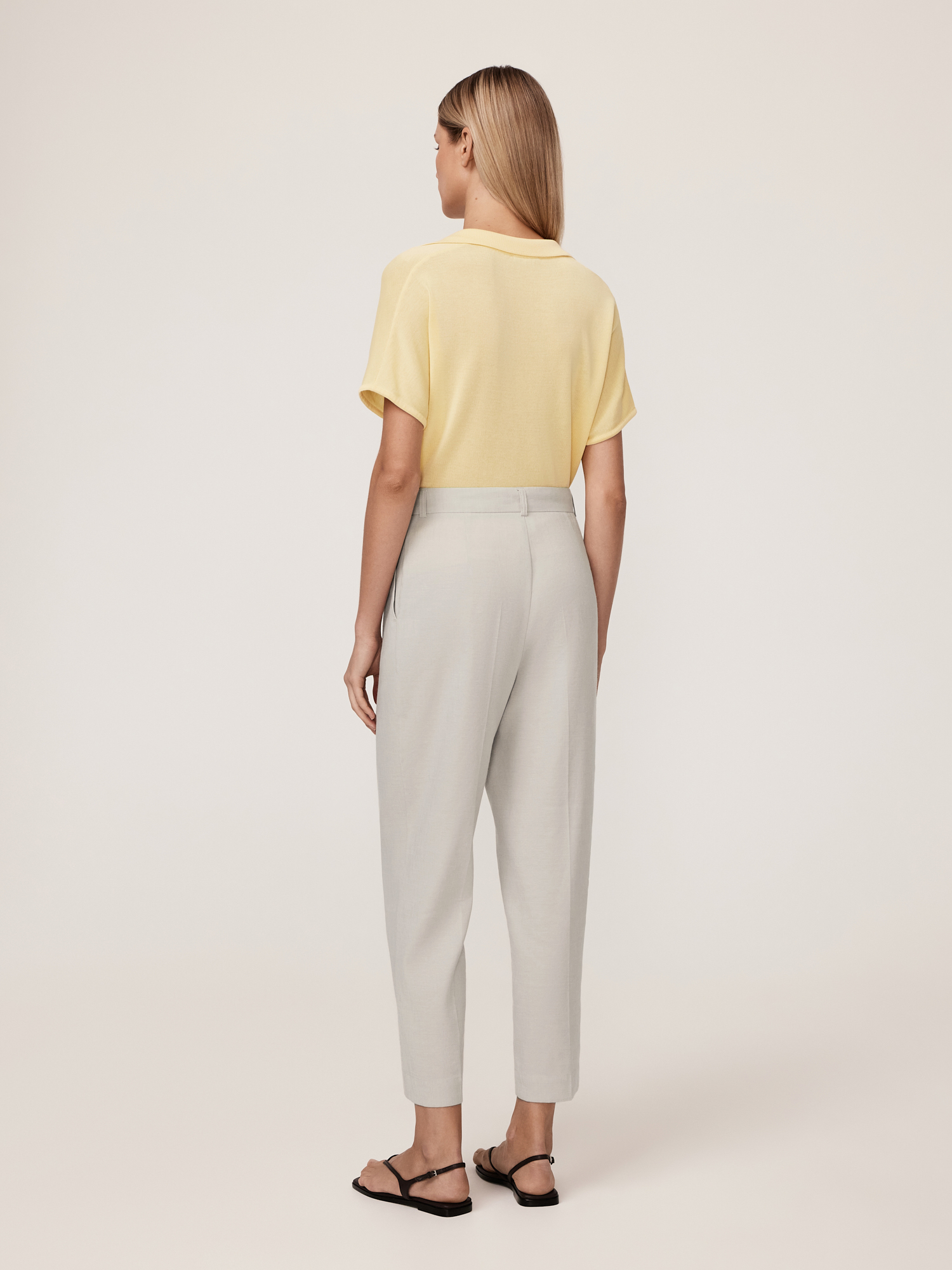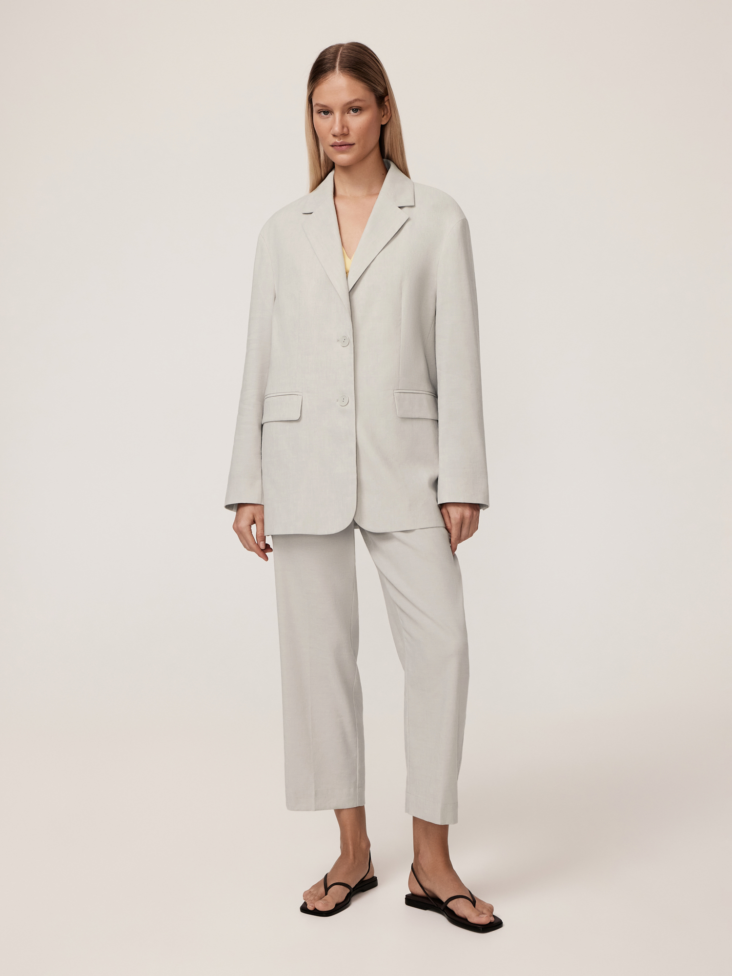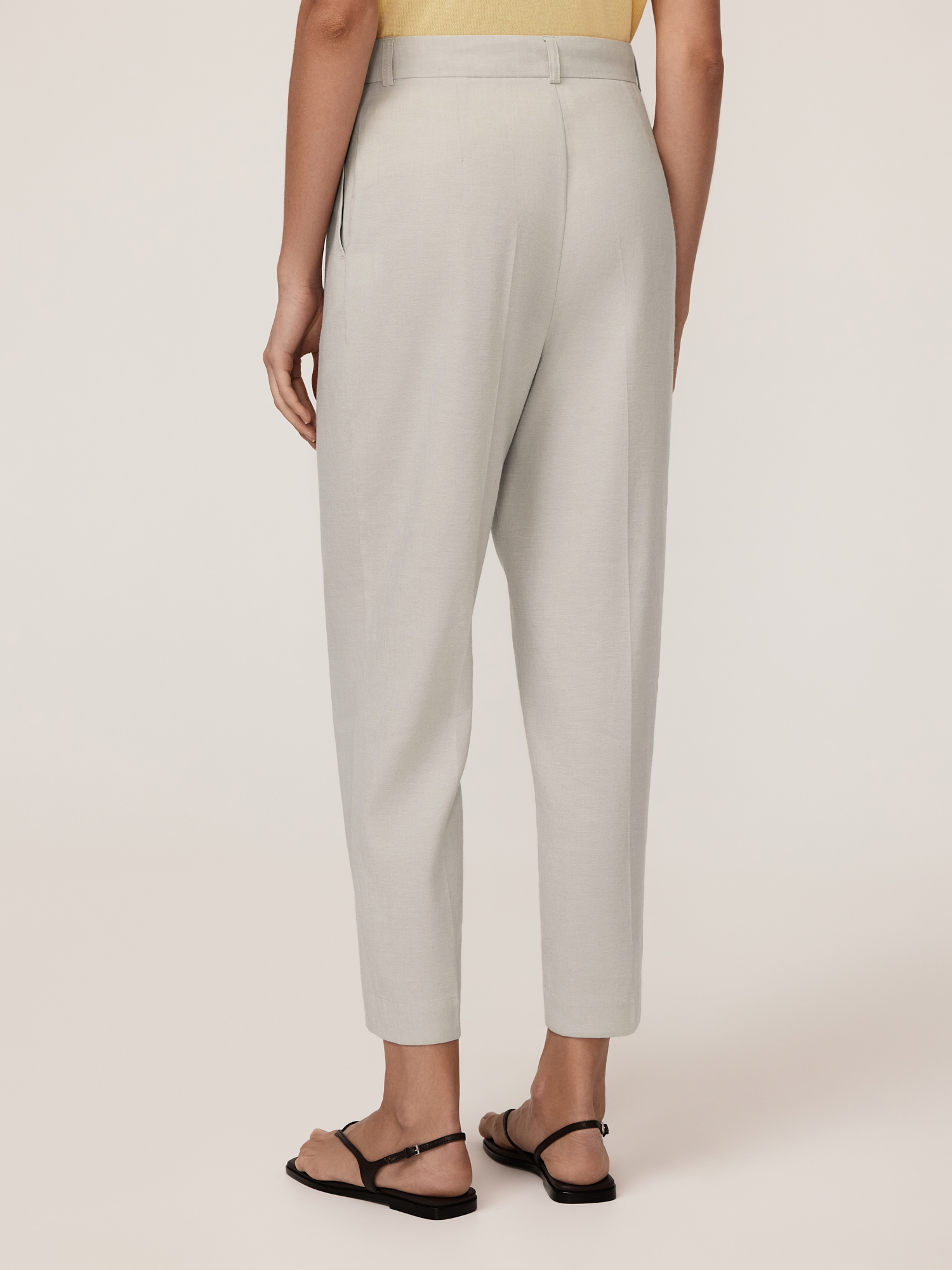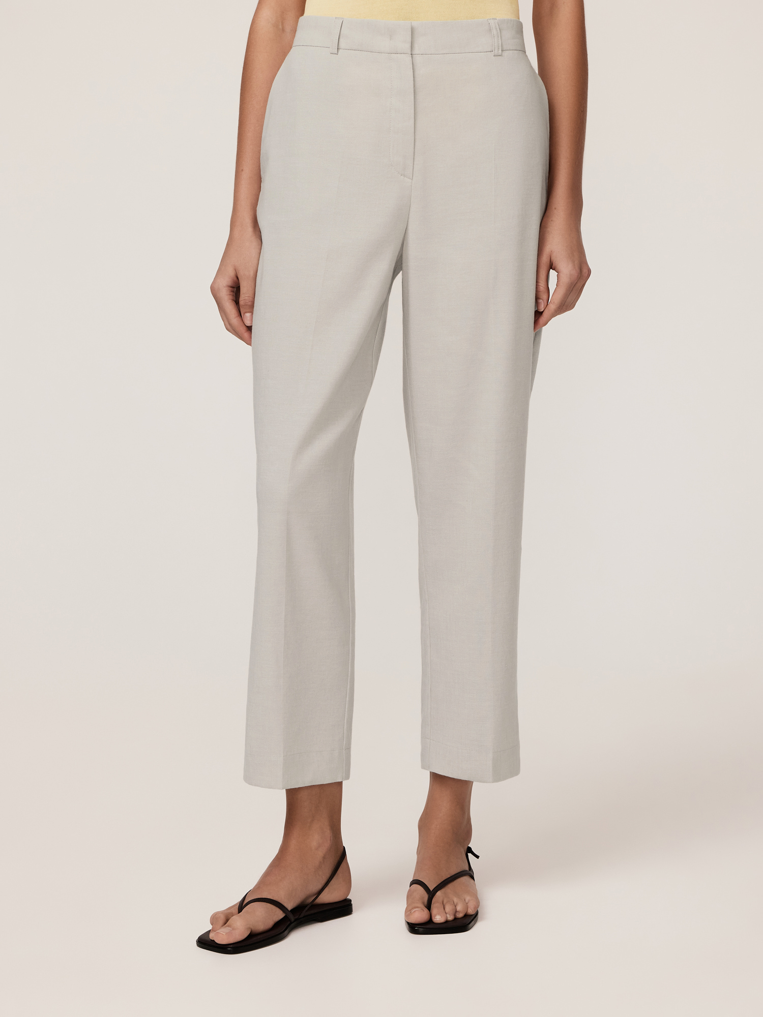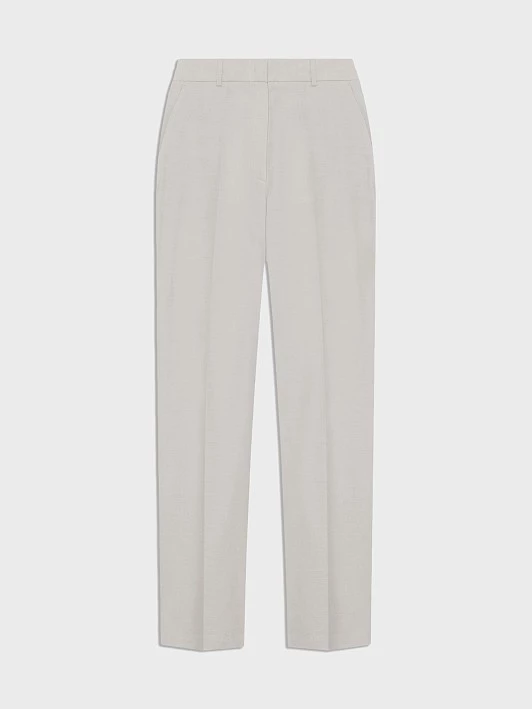 Лаконичные брюки выполнены в лучших традициях кэжуальной эстетики. Прямая модель с заутюженными стрелками дарит комфорт и свободу движений, подчеркивая естественные линии фигуры. Традиционная застежка на молнию обеспечивает удобство и поддержку, не сдавливая талию. Косые боковые карманы повышают функциональность, добавляя место для хранения мелочей. Брюки выполнены из смесовой ткани, способствующей комфортной, долгой эксплуатации изделия. Лен обеспечивает натуральность, экологичность, воздухопроницаемость и комфорт, что делает брюки приятными для носки в теплое время года. Его терморегуляционные свойства поддерживают комфортную температуру тела, охлаждая или согревая в зависимости от условий. Вискоза добавляет мягкость, создавая плавные линии и подчеркивая женственный силуэт, а полиэстер повышает износостойкость и долговечность, сохраняя форму изделия. Эластан придает ткани комфортную растяжимость и формоустойчивость, обеспечивая правильную посадку по фигуре и свободу движений. Натуральный серо-бежевый цвет служит прекрасным фоном для летнего базового гардероба. Такой оттенок универсален и комплементарен к любым цветам и оттенкам коллекции, делая брюки незаменимым участником гардеробной капсулы.
