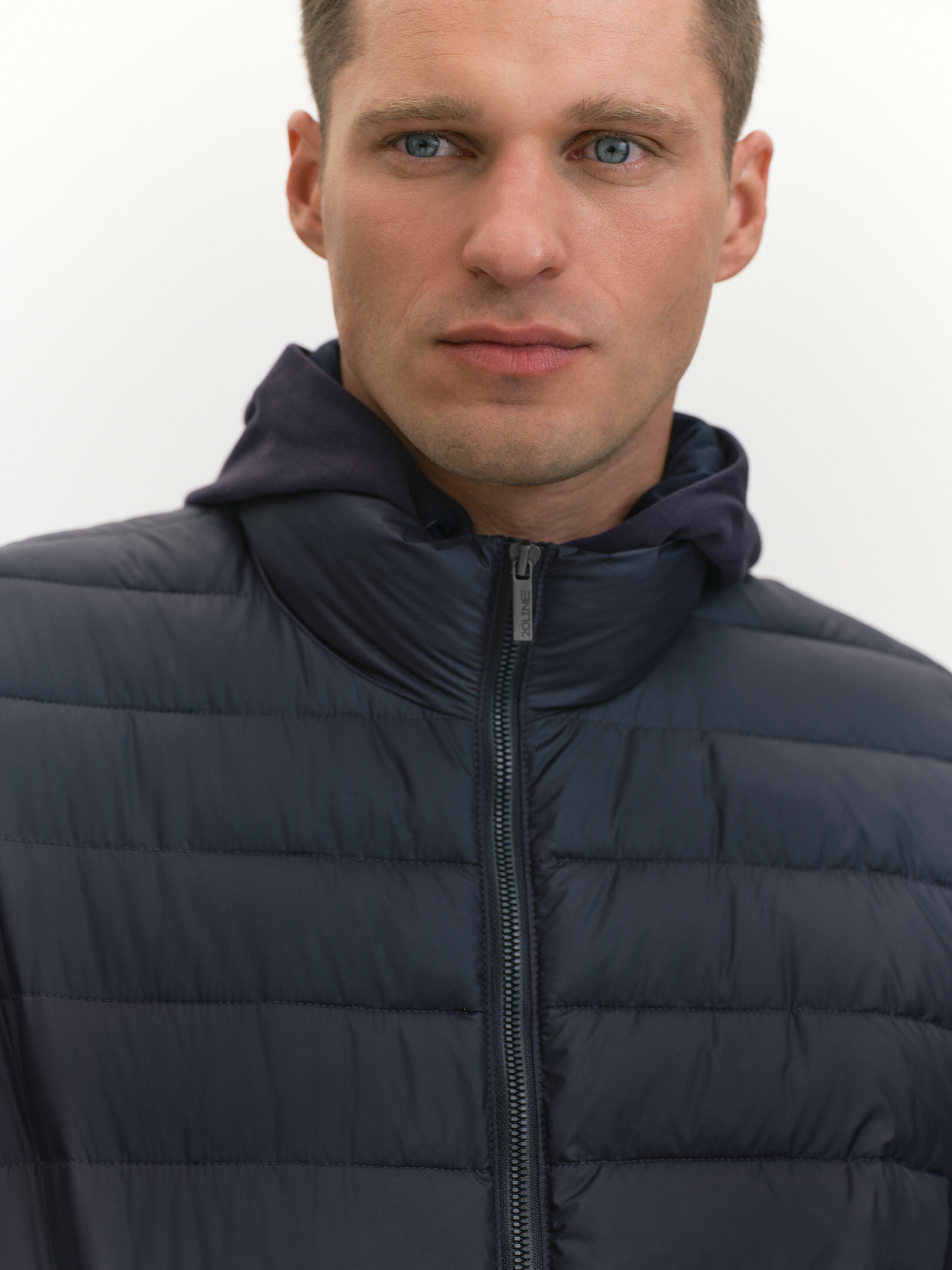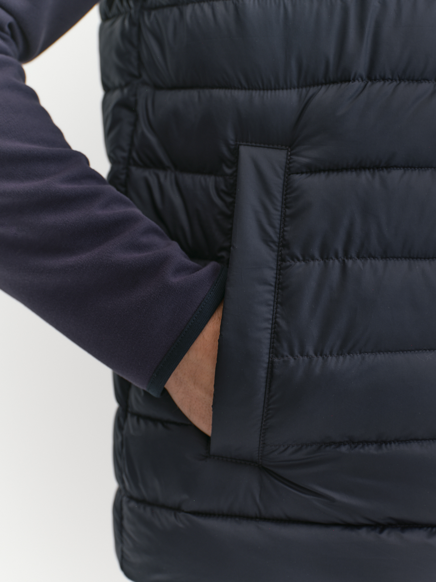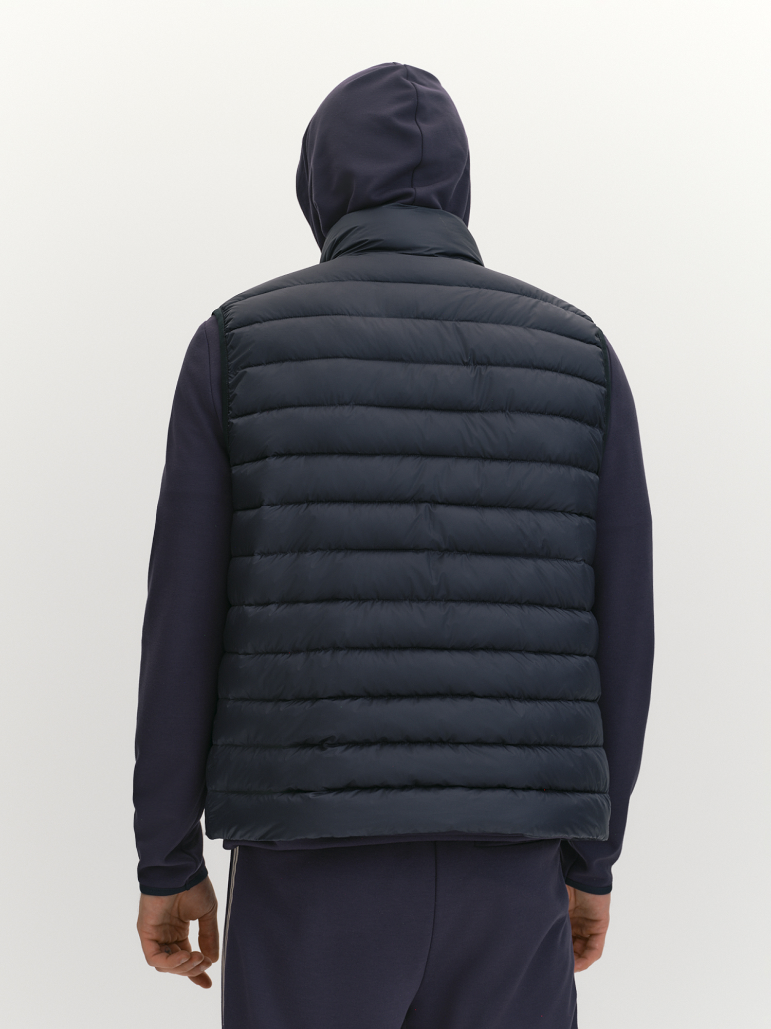 Жилет-безрукавка силуэта slim с горизонтальной стежкой подойдет для завершения образа в спортивном и кэжуал стиле. Создали модель легкой, без капюшона, но теплой. Закрытый воротник-стойка, внутренний ветрозащитный клапан, а также корд-система с фиксаторами, сконструированная по низу изделия, хорошо защищают от холода. Застегивается модель на качественную молнию с брендированным пуллером. Жилет выполнен с прорезными карманами с листочкой, имеющими вертикальный вход и застежку на кнопку, для дополнительного удобства сконструирован внутренний карман. Выбрали для модели качественную плащевую ткань с влагозащитной пропиткой и утеплили ее синтепухом. Синтепух - это современный высокотехнологичный наполнитель, отличающийся легкостью, упругостью и хорошими теплоизоляционными свойствами. Благодаря горизонтальной стежке, выполненной на нашем собственном производстве, наполнитель правильно распределен внутри изделия и надежно зафиксирован. Глубокий, контрастный и строгий темно-синий хорошо сочетается с денимом и моделями из трикотажного полотна капсулы PERFECT BASE.