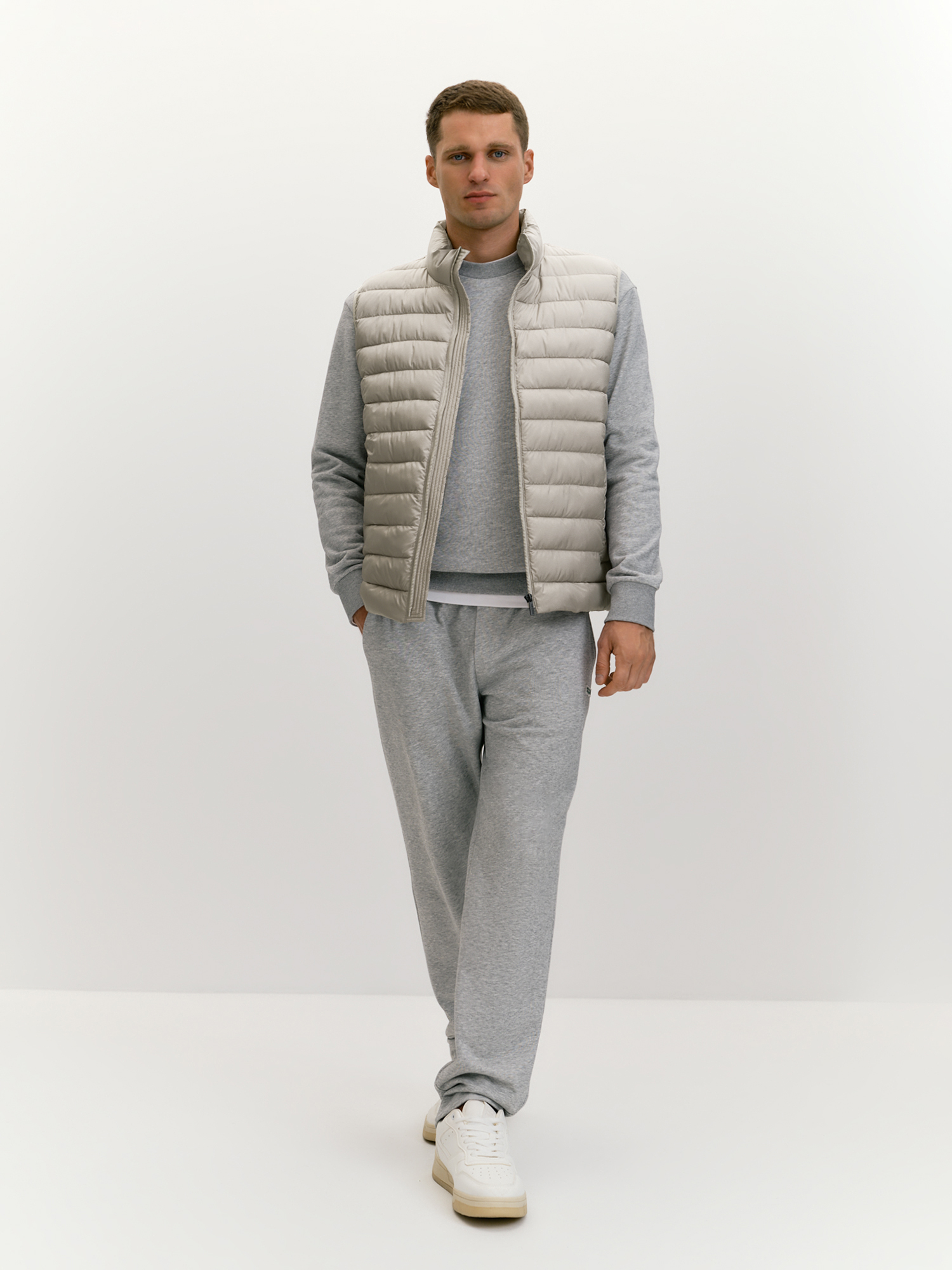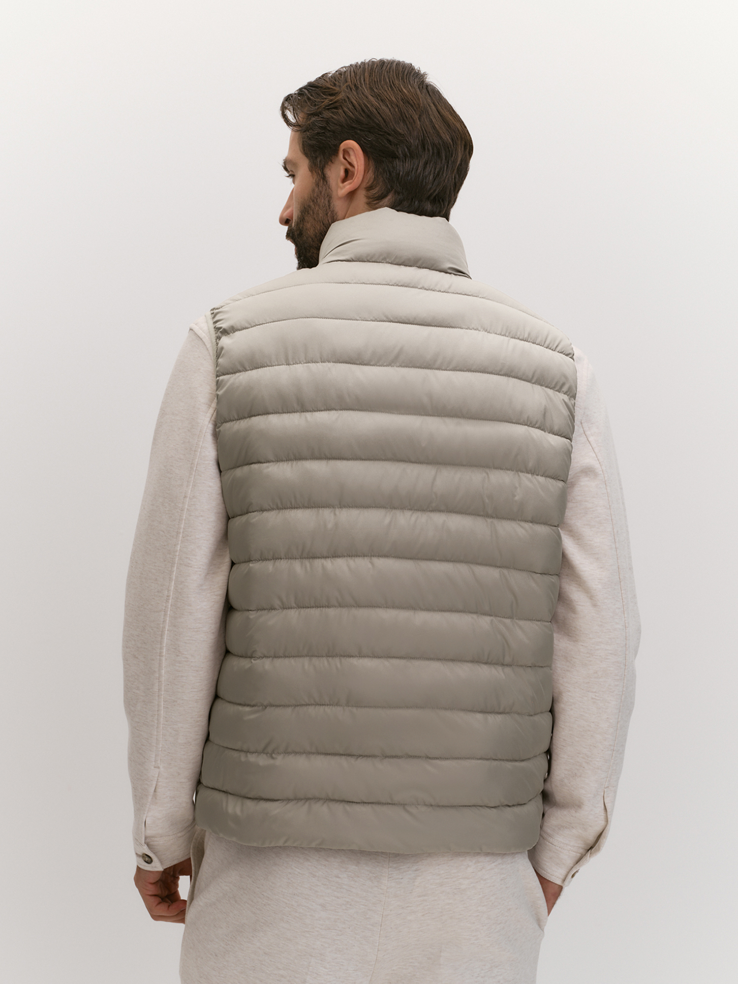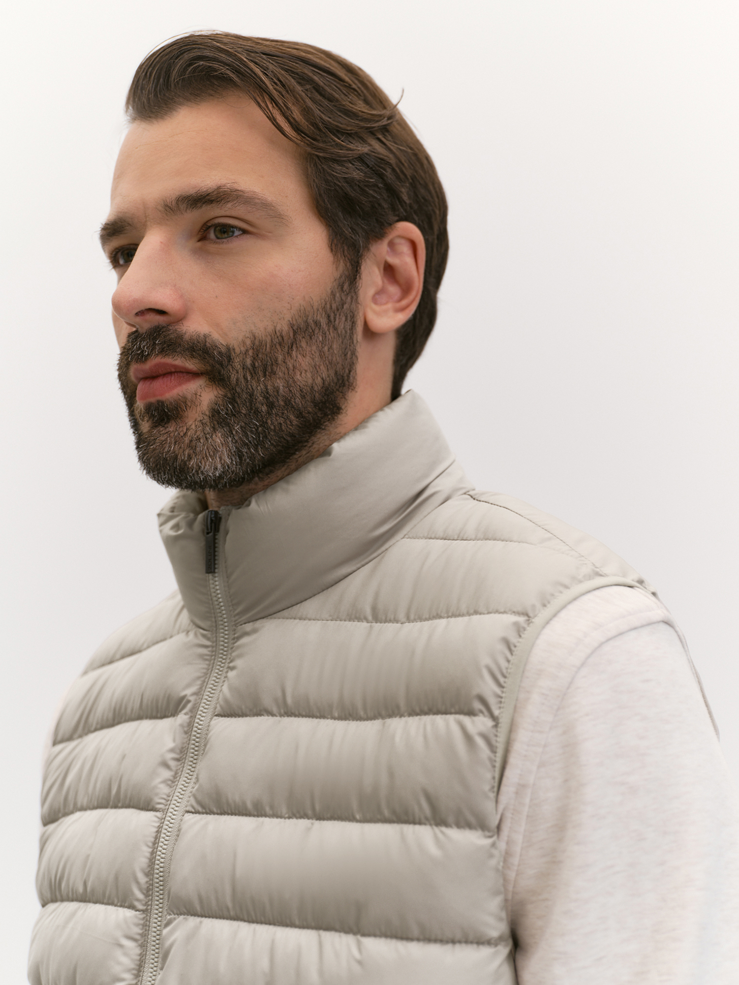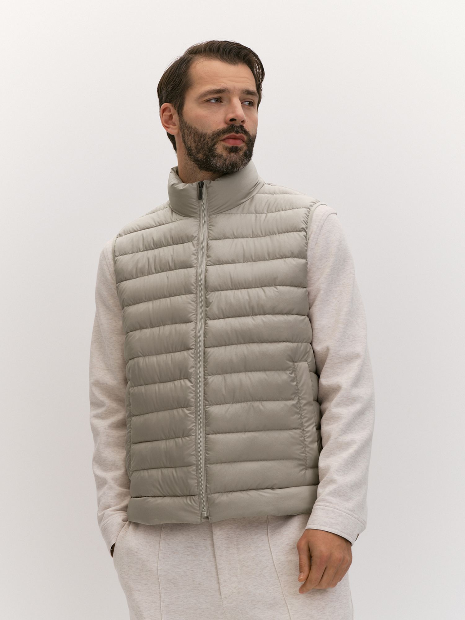 Жилет-безрукавка силуэта slim с горизонтальной стежкой подойдет для завершения образа в спортивном и кэжуал стиле. Создали модель легкой, без капюшона, но теплой. Закрытый воротник-стойка, внутренний ветрозащитный клапан, а также корд-система с фиксаторами, сконструированная по низу изделия, хорошо защищают от холода. Застегивается модель на качественную молнию с брендированным пуллером. Жилет выполнен с прорезными карманами с листочкой, имеющими вертикальный вход и застежку на кнопку, для дополнительного удобства сконструирован внутренний карман. Выбрали для модели качественную плащевую ткань с влагозащитной пропиткой и утеплили ее синтепухом. Синтепух - это современный высокотехнологичный наполнитель, отличающийся легкостью, упругостью и хорошими теплоизоляционными свойствами. Благодаря горизонтальной стежке, выполненной на нашем собственном производстве, наполнитель правильно распределен внутри изделия и надежно зафиксирован. Светлый весенний бежево-серый хорошо сочетается с денимом и моделями из трикотажного полотна капсулы PERFECT BASE.