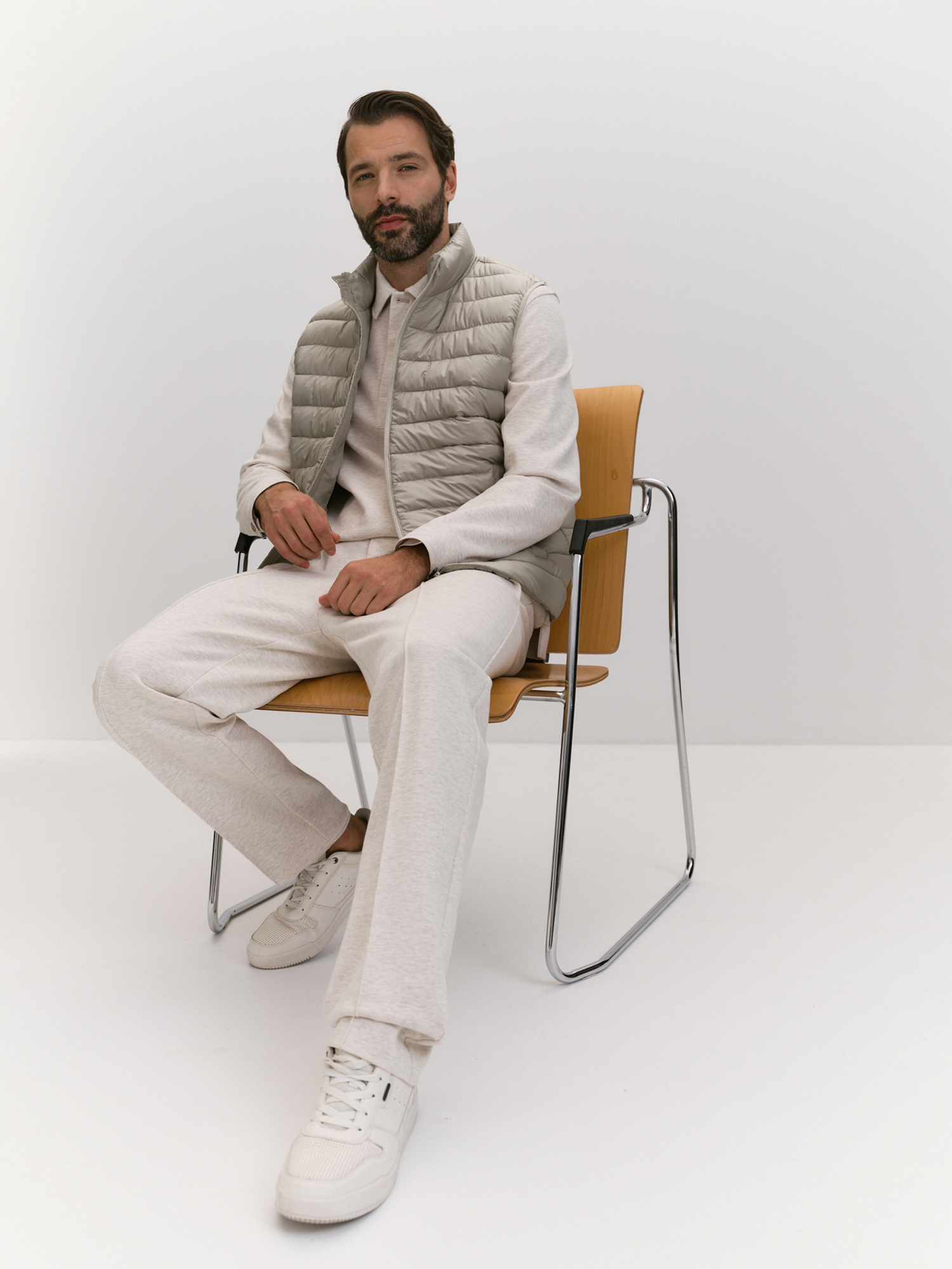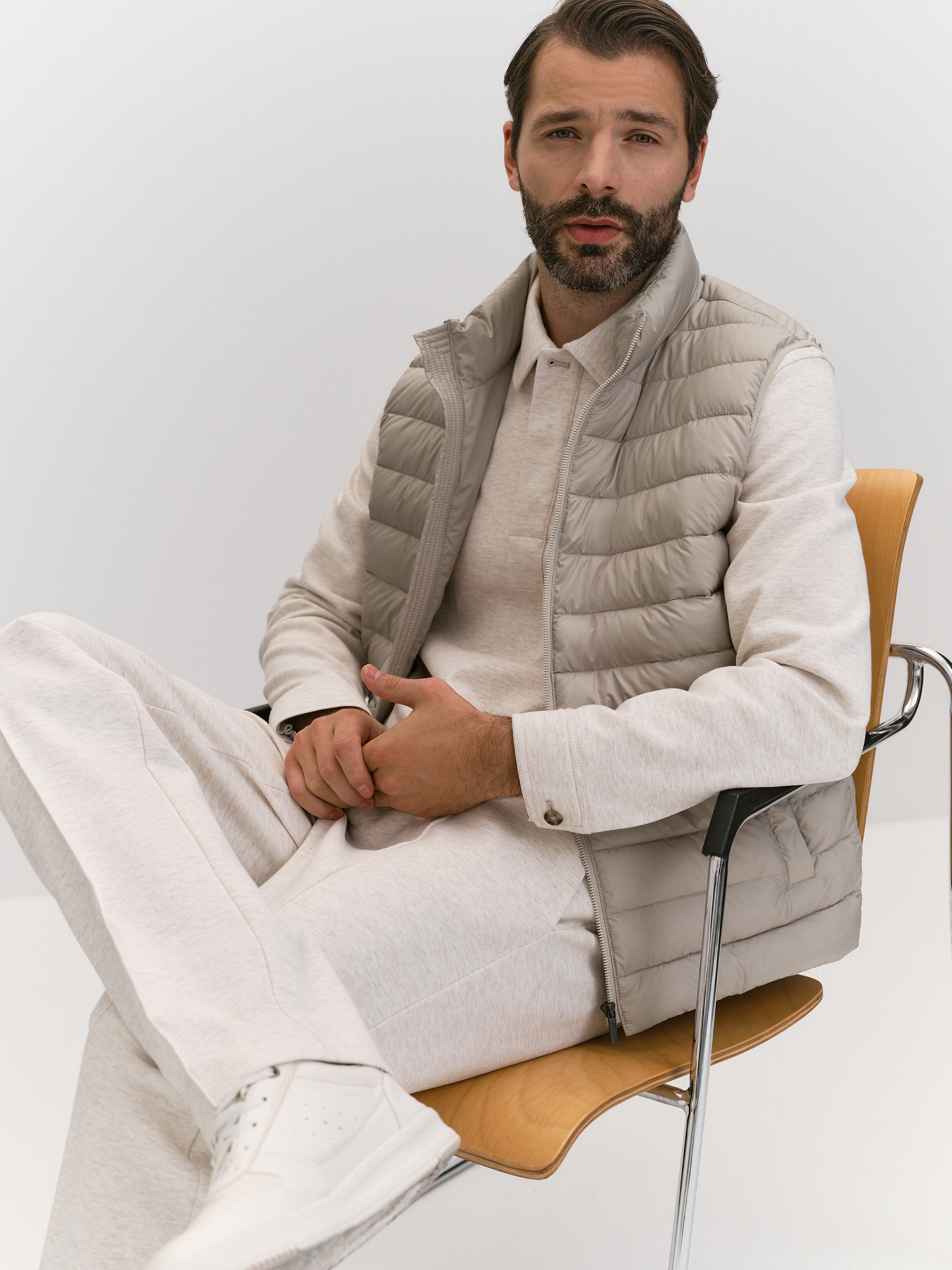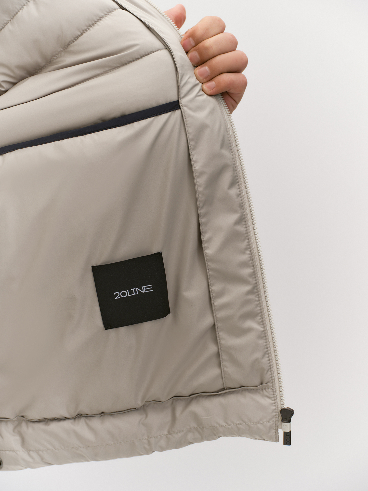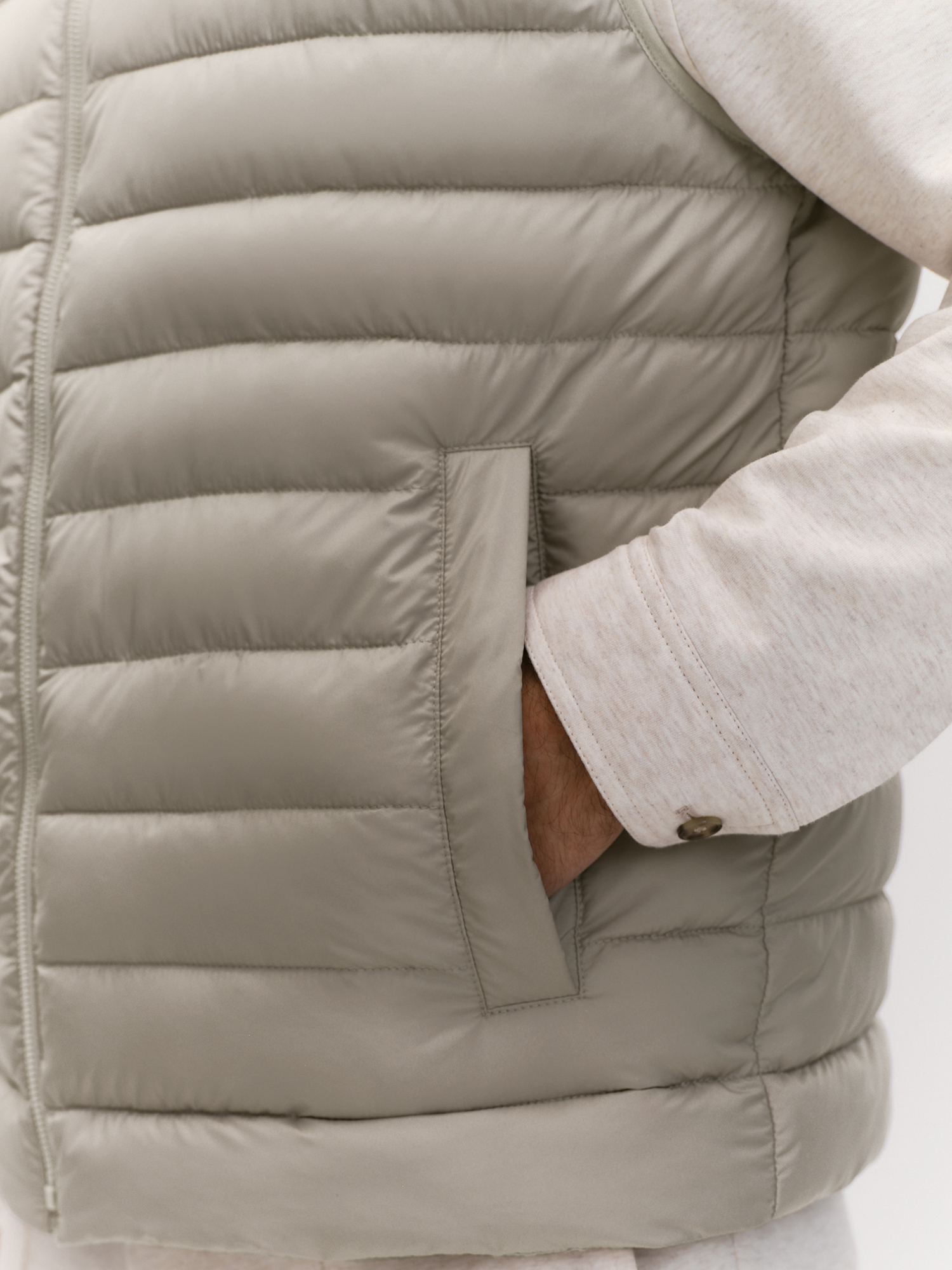 Жилет-безрукавка силуэта slim с горизонтальной стежкой подойдет для завершения образа в спортивном и кэжуал стиле. Создали модель легкой, без капюшона, но теплой. Закрытый воротник-стойка, внутренний ветрозащитный клапан, а также корд-система с фиксаторами, сконструированная по низу изделия, хорошо защищают от холода. Застегивается модель на качественную молнию с брендированным пуллером. Жилет выполнен с прорезными карманами с листочкой, имеющими вертикальный вход и застежку на кнопку, для дополнительного удобства сконструирован внутренний карман. Выбрали для модели качественную плащевую ткань с влагозащитной пропиткой и утеплили ее синтепухом. Синтепух - это современный высокотехнологичный наполнитель, отличающийся легкостью, упругостью и хорошими теплоизоляционными свойствами. Благодаря горизонтальной стежке, выполненной на нашем собственном производстве, наполнитель правильно распределен внутри изделия и надежно зафиксирован. Светлый весенний бежево-серый хорошо сочетается с денимом и моделями из трикотажного полотна капсулы PERFECT BASE.