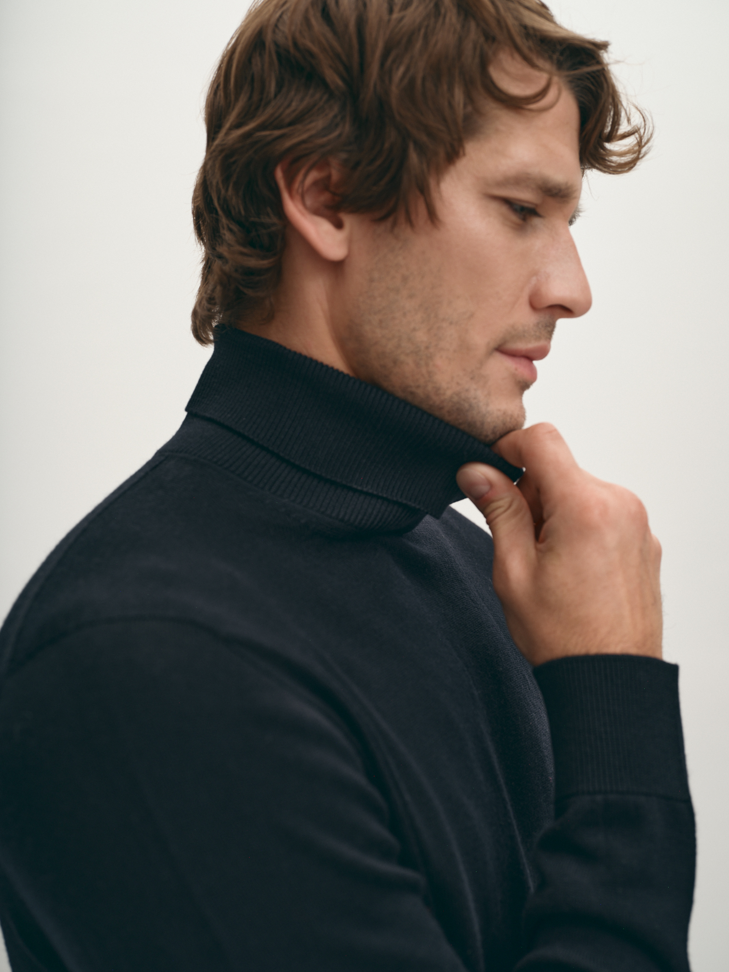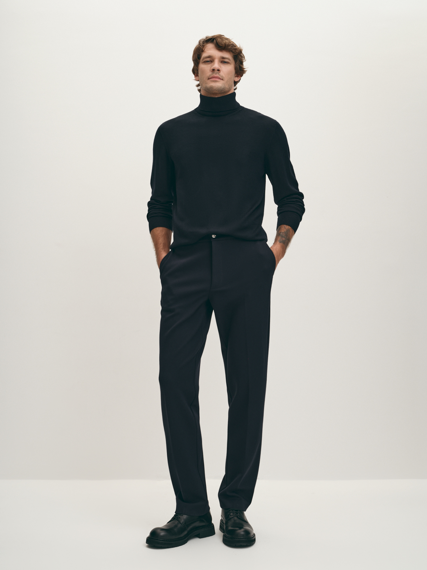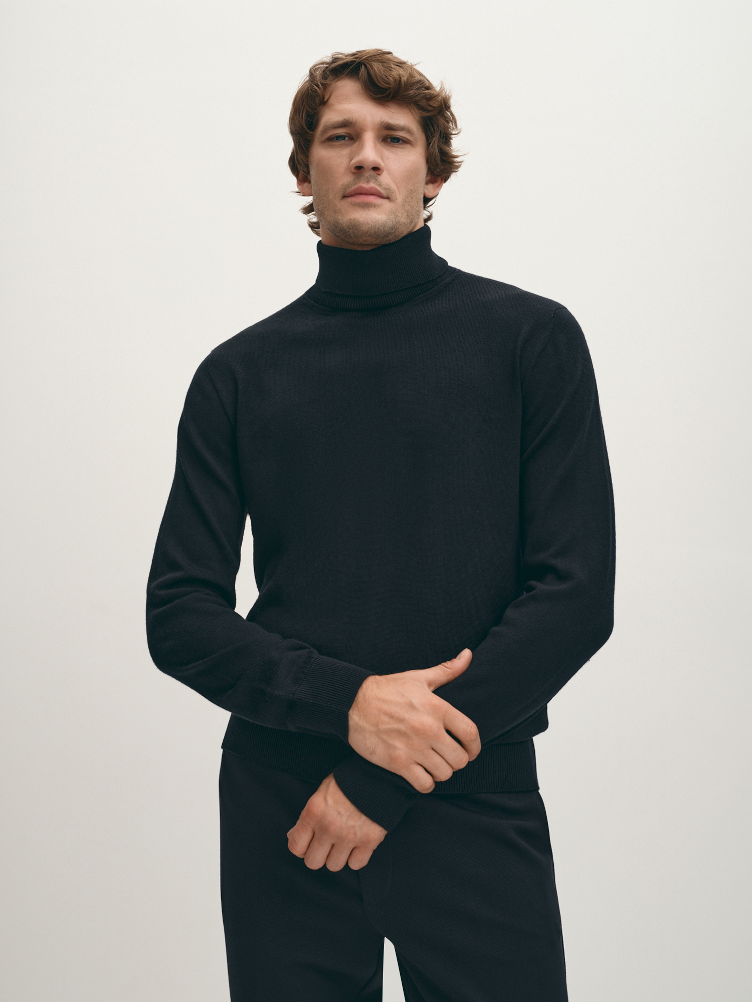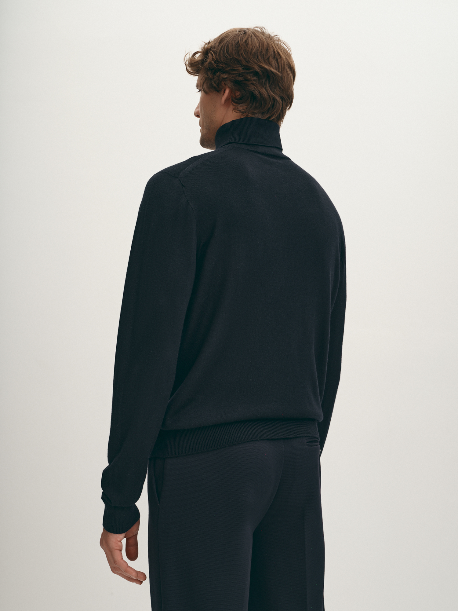 Универсальная вязаная водолазка тёмно-синего оттенка. Шерсть мериноса в составе надёжно сохраняет тепло, фирменная эластичная вязка обеспечивает комфортную посадку по фигуре. Модель прямого силуэта, с естественной линией плеча и длинным втачным рукавом. Воротник-стойка с отворотом, манжеты на рукавах и манжет по низу изделия - в мелкий фактурный рубчик. Уютная водолазка дополнит как лук в стиле кэжуал, так и нестрогий деловой образ.