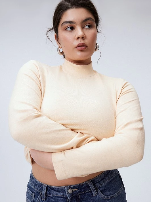 Джемпер комфортного облегания с горлом, средним по высоте воротником-стойкой и втачным длинным рукавом. Выбрали для базового гольфа смесовый трикотаж с содержанием шерсти. Кроеный трикотаж отличается особой эластичностью и мягкостью благодаря высокому содержанию нейлона, характеризуется гигроскопичностью (хорошо впитывает воду) и высокими показателями воздухопроницаемости – за это спасибо вискозе. Шерсть согревает, полиэстер же отвечает за продление срока службы и возможность долго носить модель из такой ткани под верхнюю одежду. Водолазка в нежном желтом больших размеров будет востребована как офисная, школьная, повседневная.