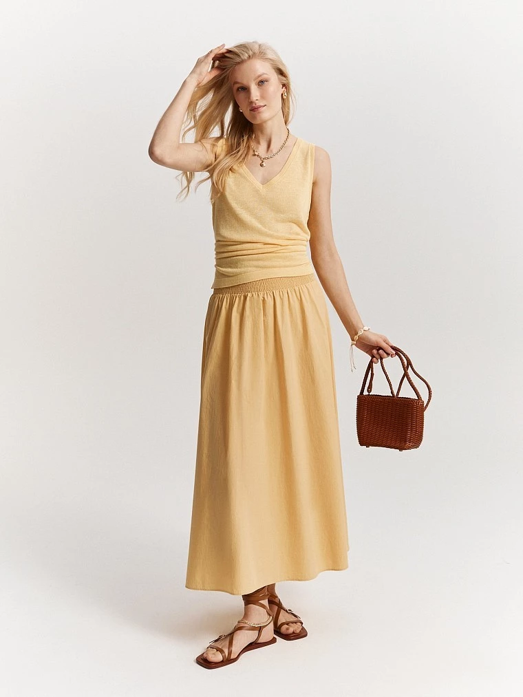 Воздушная юбка-миди мягкого жёлтого оттенка выполнена из качественного 100% хлопка с легким краш-эффектом. Органический хлопок с особым плотным переплетением нитей отлично держит форму и при этом прекрасно пропускает воздух. Модель дополнена комфортным широким поясом-резинкой, который обеспечивает удобную посадку и формирует лёгкие драпировки. Юбка станет ярким дополнением гардероба, а для создания стильного total look рекомендуем комбинировать ее с укороченной рубашкой из коллекции.
