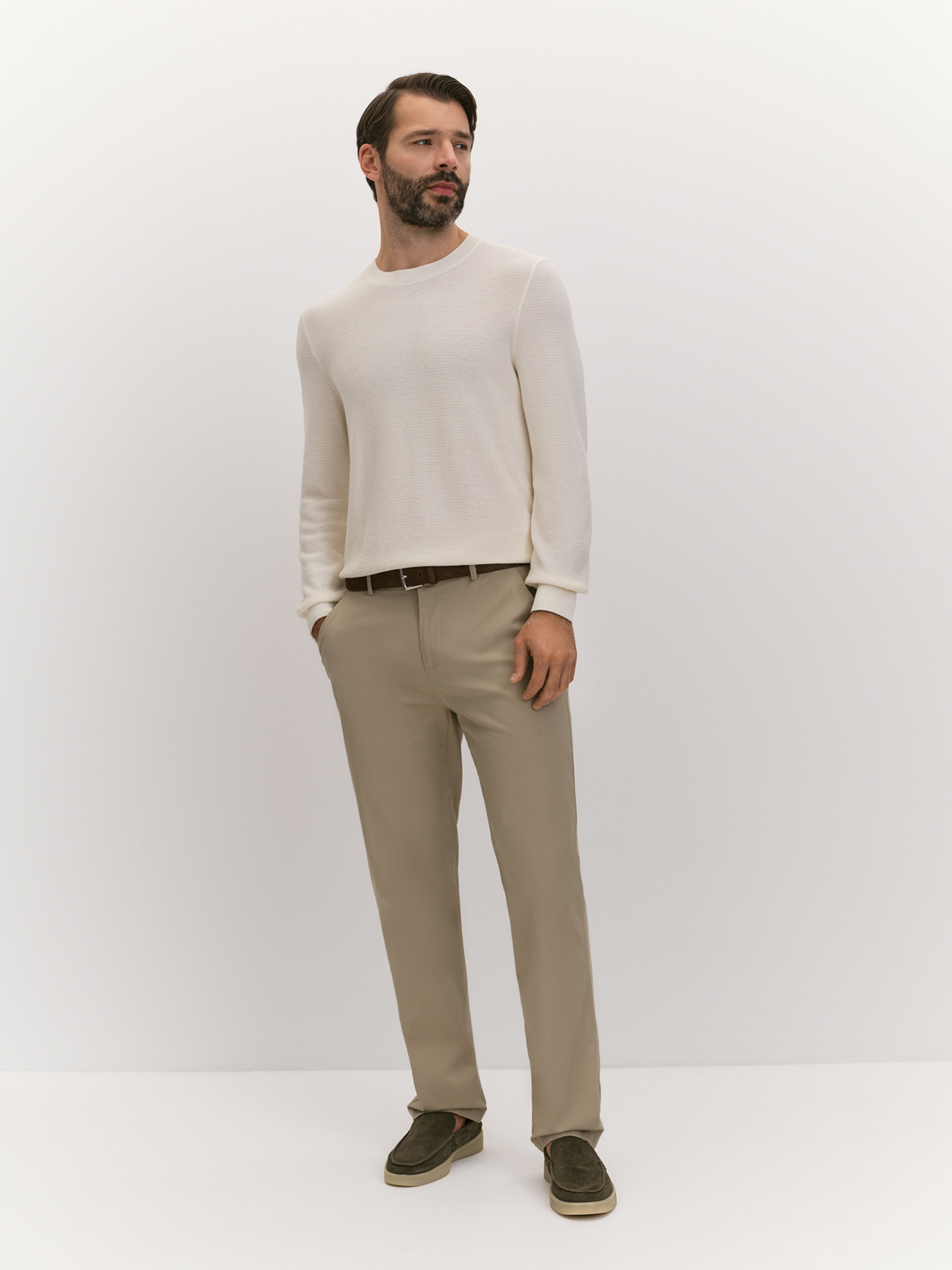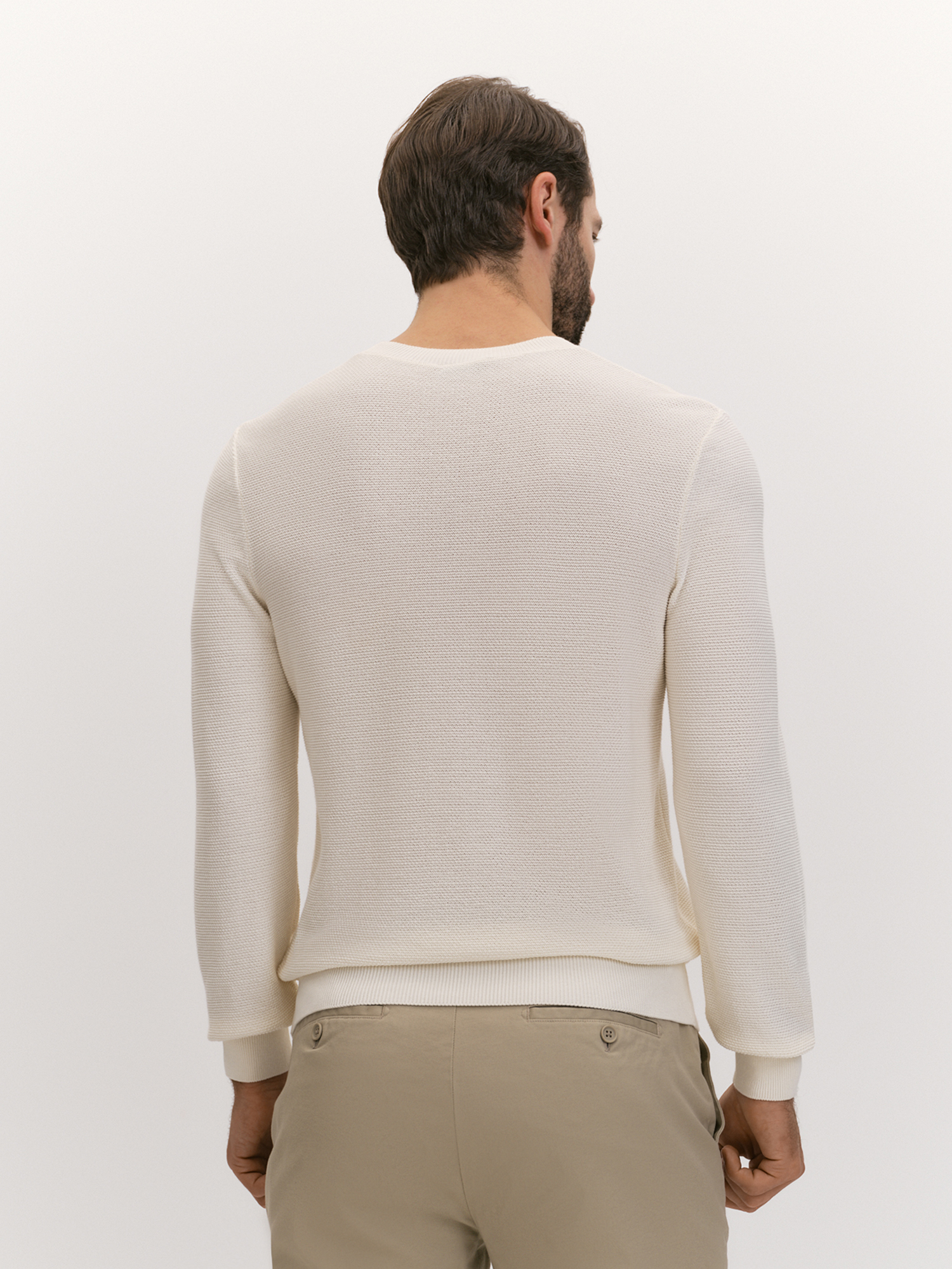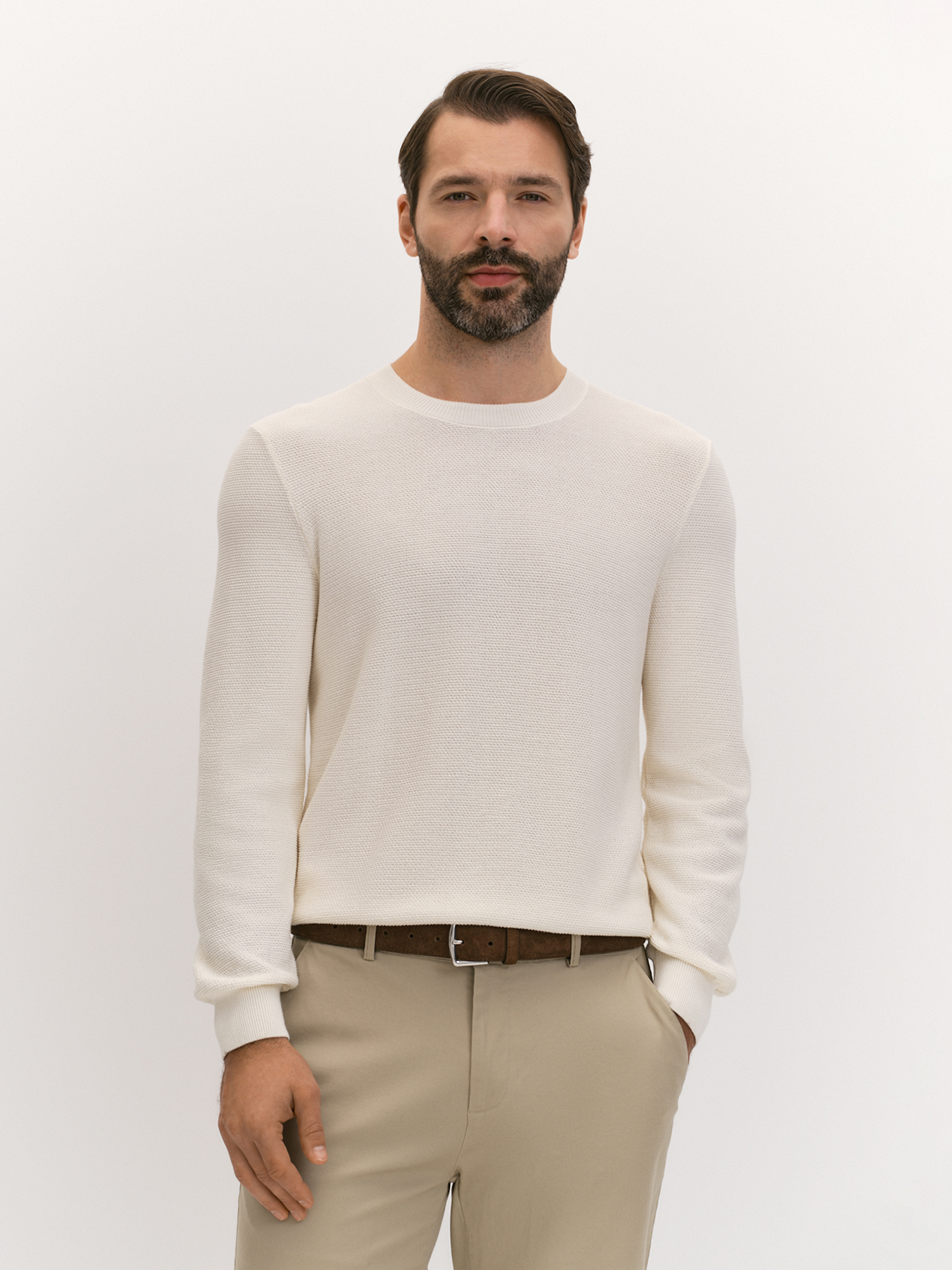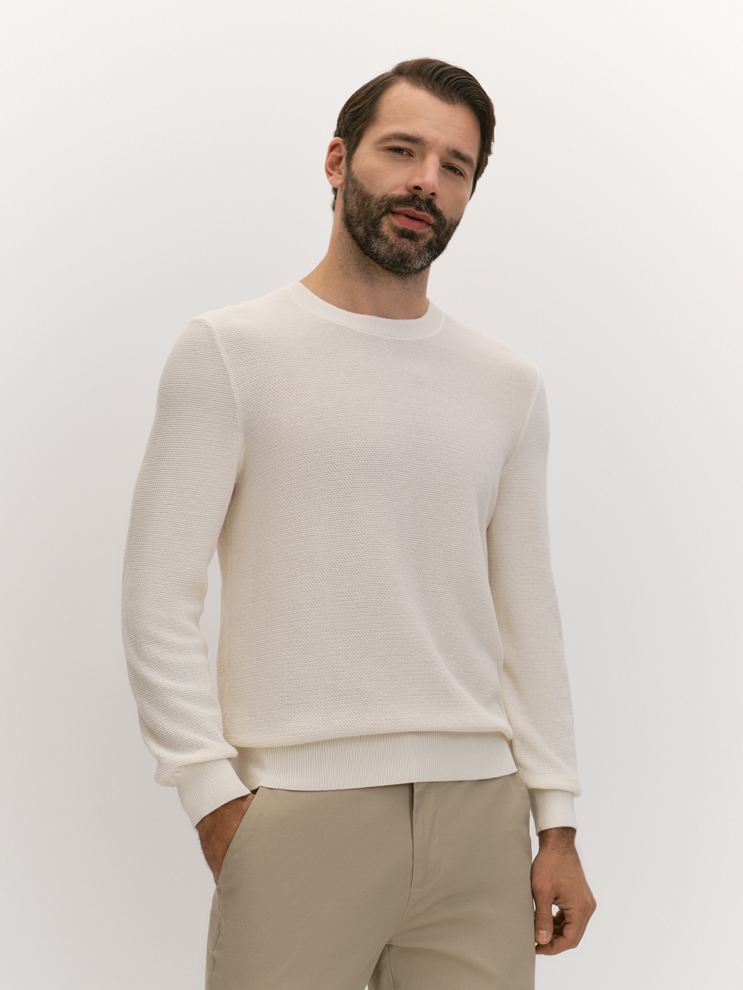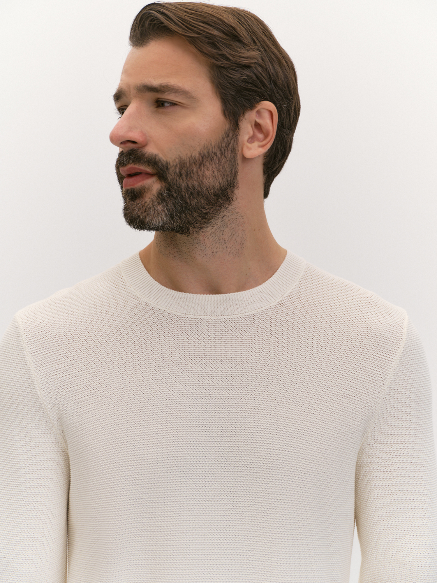 Джемпер выполнен из премиального длинноволокнистого хлопка, который делает пряжу более гладкой, прочной и мягкой. Более длинные волокна хлопка способствуют меньшей пилингуемости, большей воздухопроницаемости и эффективнее впитывают влагу. Джемпер с рифленой структурой вязки обладает особым характером и терморегуляционным "прохладным эффектом", что позволяет носить его до уверенной плюсовой температуры. Детали модели вывязаны точно по лекалу на японской плосковязальной машине Shima Seiki. Соединительные швы выполнены на специальном кеттельном оборудовании с высокой долей ручного труда. Это премиальная, дорогая, практически незаметная обработка без потери эластичности. Трендовый сливочный оттенок актуален как никогда и подойдет для офиса, праздника, прогулки, повседневной носки.