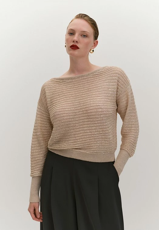Джемпер с возможностью трансформации - можно носить его с вырезом лодочкой или открыть одно плечо. Модель достаточно свободная, широкие манжеты и резинка по низу "собирают" ее и придают завершенный вид. Выбрали для джемпера два вида пряжи. Яркие полосы с пайетками выполнены из пряжи одной из лучших фабрик Китая, а более прозрачные, однотонные полоски - из премиальной поливискозной итальянской пряжи. Такое сочетание придает свитеру легкость и тактильный комфорт. Модель выполнена на японской плосковязальной машине Shima Seiki. Боковые швы и швы рукава джемпера соединены на кеттельном оборудовании, получается эластичный шов. Горловина также прикетлевана, причем таким образом, что швы спрятаны внутрь бейки и совсем не видны. Такая обработка не стесняет движений и позволяет предложить премиальный продукт. Джемпер больших размеров в базовом бежевом подойдет для деловой встречи, офиса, школы, прогулки, встречи с друзьями, вечеринки, праздника. Модель требует особенно деликатного отношения. Просим Вас при примерке и последующей эксплуатации не сочетать джемпер с острыми украшениями и другими аксессуарами.