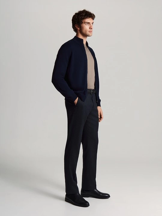 Комфортный кардиган гладкой вязки в уверенном темно-синем - трендовая, универсальная модель. Он дополнит образ из костюмных брюк и рубашки, джинсов и футболки, а также составит актуальный многослойный комплект с блейзером пье-де-пуль и джинсами. Вязаные изделия из шерсти мериноса обеспечивают комфортную температуру для тела, хорошо тянутся и не сковывают движения. Все потому, что шерсть мериноса отличается особой тонкостью волоса, высокой прочностью, влагопоглощением и мягкостью волокон. Хлопок в составе пряжи кардигана гипоаллергенен, хорошо дышит, удобен в эксплуатации. Детали модели вывязаны точно по лекалу на японской плосковязальной машине Shima Seiki. Соединительные швы выполнены на специальном кеттельном оборудовании с высокой долей ручного труда. Это премиальная, дорогая, практически незаметная обработка без потери эластичности. Такой кардиган может послужить полноценной альтернативой пиджаку, он подойдет для офиса, праздника, прогулки, повседневной носки.