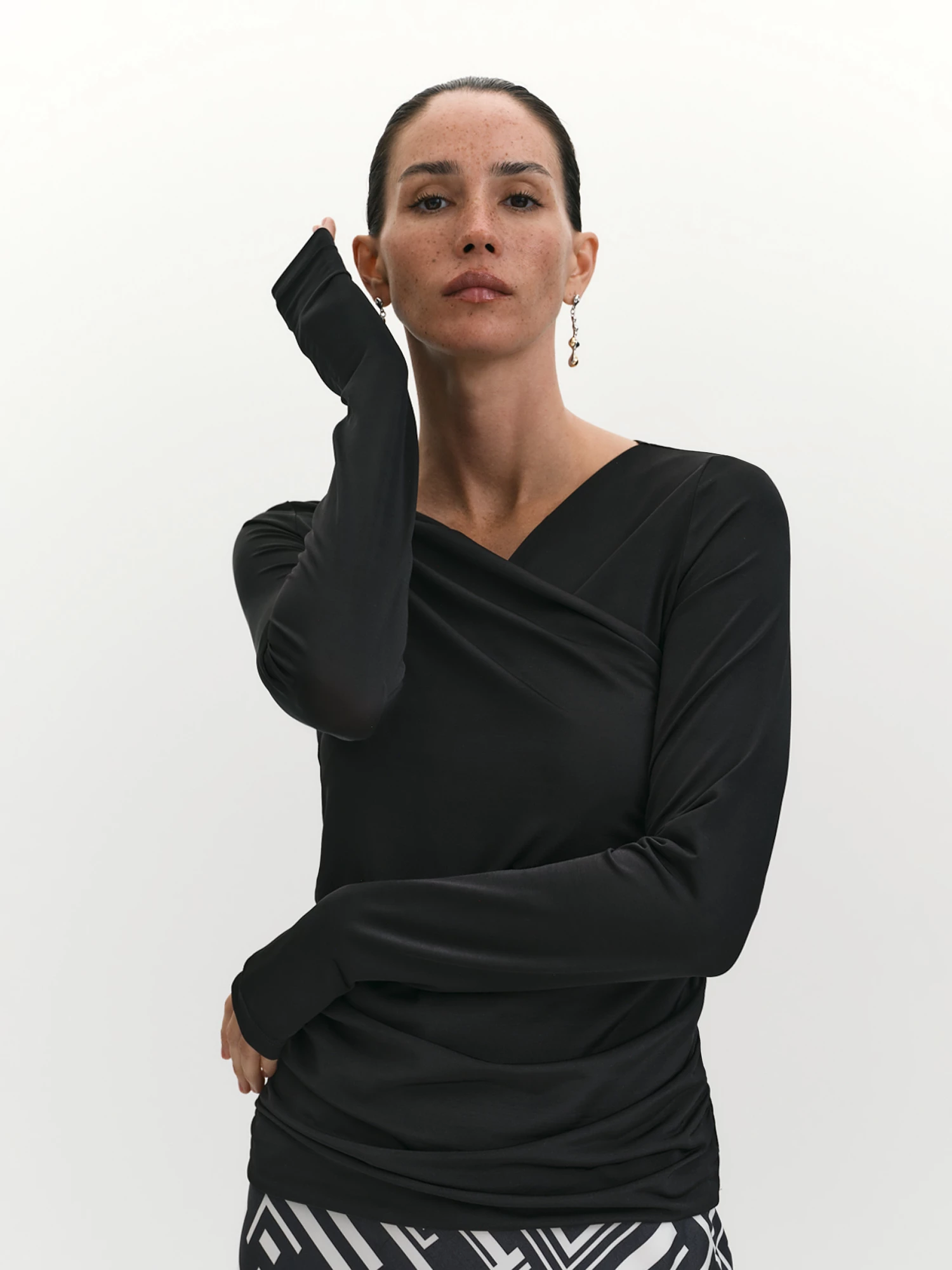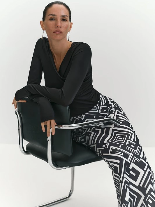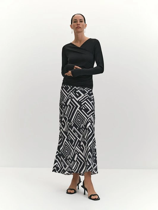 Юбку длины макси выполнили с легким расклешением книзу, выбрав крой в стилистике mermaid-core. Модель с высоким тактильным качеством и максимальной воздухопроницаемостью логично, с течением времени, перейдет из весеннего в летний гардероб. То, что ахроматические черный и белый не подчиняются никаким правилам сочетаний цветов, а потому универсальны, позволяет адаптировать юбку к верхам любых оттенков. Динамичный геометрический принт дисциплинирует модель и делает ее полноправной участницей образов print block, позволяя сочетания с любыми однотонными моделями. В весенней коллекции есть возможность создать с юбкой образ full-body, создав смелое сочетание черно-белого низа с бело-черной блузой.