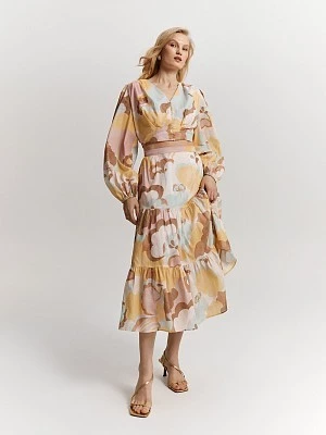 Многоярусная юбка с высокой посадкой в длине миди выполнена из тонкого батиста с пастельным цветочным принтом. Модель полуприлегающего силуэта с расширением к низу, застёжкой на боковую потайную молнию и хлопковой подкладкой. С блузкой из того же материала составит яркий женственный образ.
