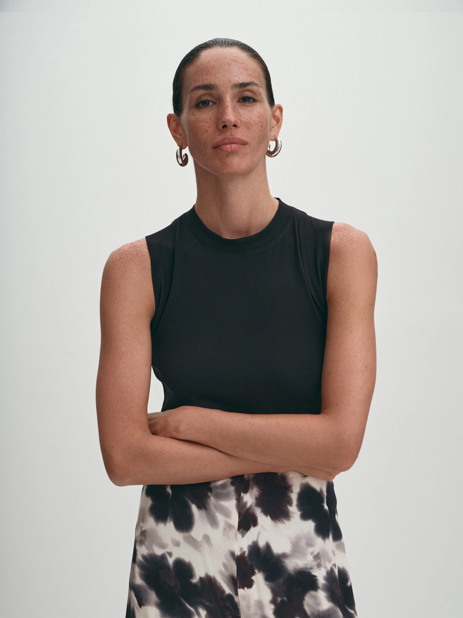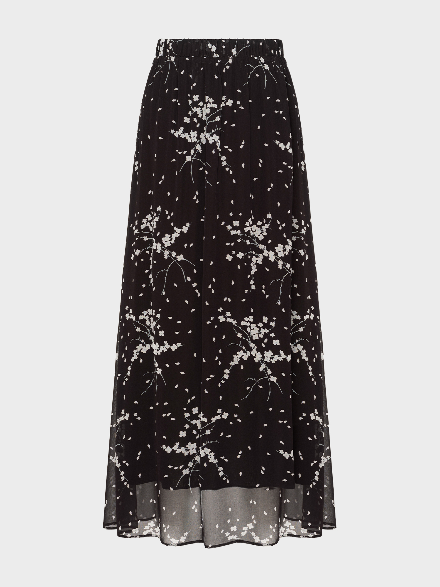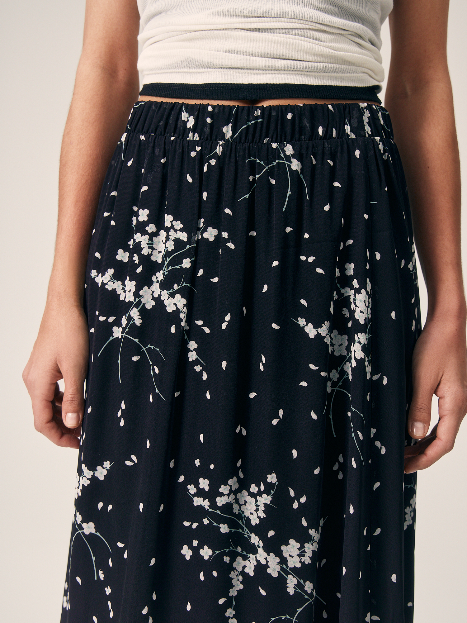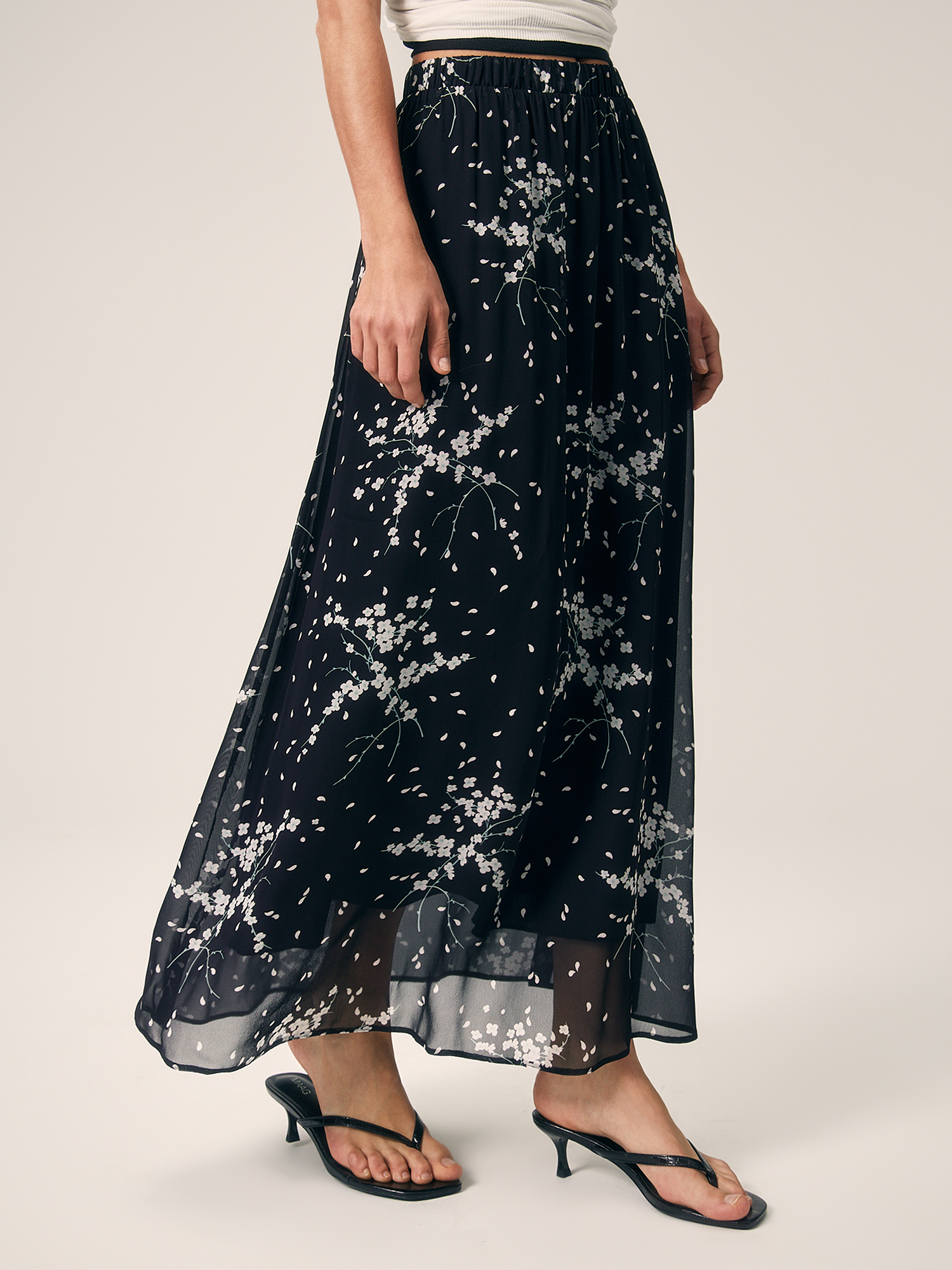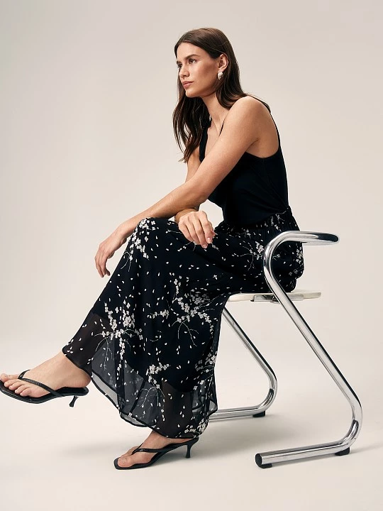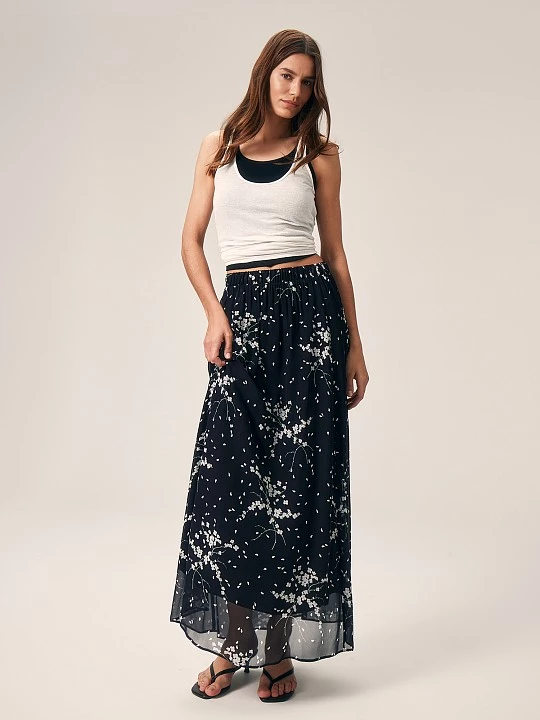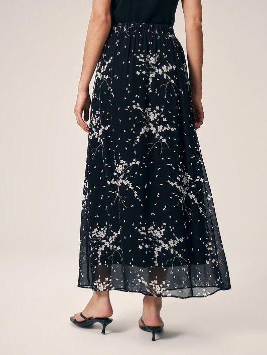 Юбка выполнена в стиле "романтический кэжуал". Флоральный принт и шифон добавляют ей женственности и утонченности. Лаконичный дизайн и широкая резинка по поясу делают модель подходящей для каждого дня. Вискозный шифон обеспечивает легкость, мягкость и приятные тактильные ощущения. Он хорошо пропускает воздух, что делает юбку комфортной для теплого времени года. Для маскировки прозрачности шифона модель дополнена тактильно приятной тонкой подкладкой, также из 100% вискозы. Модель в универсальном черном цвете создает сдержанный и изысканный образ. Флоральный принт, являющийся лейтмотивом капсулы, делает ее актуальной в новом сезоне. Миди-длина универсальна, она подходит для различных типов фигур и ситуаций, добавляет образу элегантности и изысканности. Широкая резинка в поясе обеспечивает удобную посадку и поддержку, не сдавливая талию.