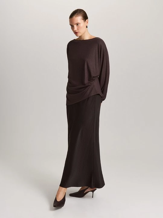 Юбка длины миди с радиальным, или расходящимся, гофре в насыщенном коричневом оттенке – настоящая находка для ценительниц безупречной посадки. Роскошные радиальные складки создают эффект объемного движения, играя бликами света при каждом шаге и превращая простую прогулку в изысканный перформанс, в то время как благородный глубокий коричневый цвет придает образу ноту аристократической изысканности и теплой глубины. Тонкий отрезной пояс подчеркивает изящную талию, создавая женственный акцент, а потайная молния сбоку сохраняет безупречную чистоту линий, делая силуэт идеально гармоничным. Ткань тактильно приятной плотности обеспечивает идеальную форму складкам, позволяя им сохранять свою выразительность в течение всего дня, не теряя первоначального объема и структуры, а также дарит приятное ощущение качества и статусности при ношении. Юбка будет уместна в самых разных ситуациях: от строгого офисного лука с лаконичным жакетом до романтического образа с кружевным топом, от интеллектуального стиля с объемным свитером до вечернего выхода с шелковой блузой. Ее универсальная миди-длина визуально вытягивает силуэт, а благородный коричневый цвет делает модель идеальной базой для любых цветовых сочетаний – от нежных пастельных тонов до смелых ярких акцентов.