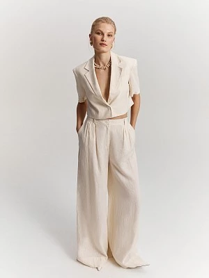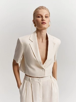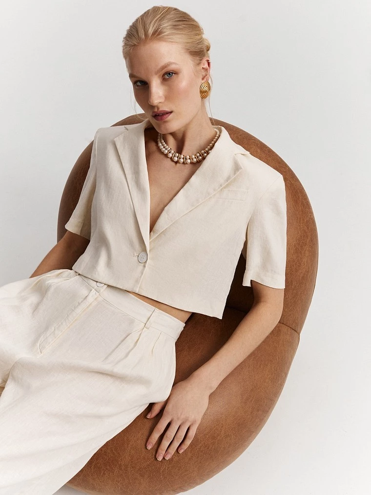 Укороченный однобортный жакет из 100% льна в природном оттенке. Легкая мягкая ткань приятна на ощупь и не препятствует циркуляции воздуха. Модель прямого силуэта на хлопковой дышащей подкладке с укороченными рукавами и классическими лацканами. Для создания стильного тоtotal look рекомендуем комбинировать жакет с юбкой или широкими брюками из нашей коллекции.