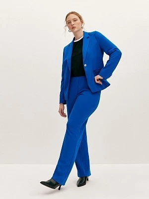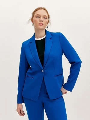 Однобортный жакет из вискозного трикотажа глубокого синего цвета. Модель прилегающего силуэта, на частичной подкладке, с втачным рукавом со шлицей с пуговицами, отложным воротником с лацканом, карманами в рамку и застёжкой на контрастную пуговицу. Моделирующие талиевые вытачки отвечают за удачную посадку на любой тип фигуры. Составит однотонный комплект с брюками из той же коллекции.