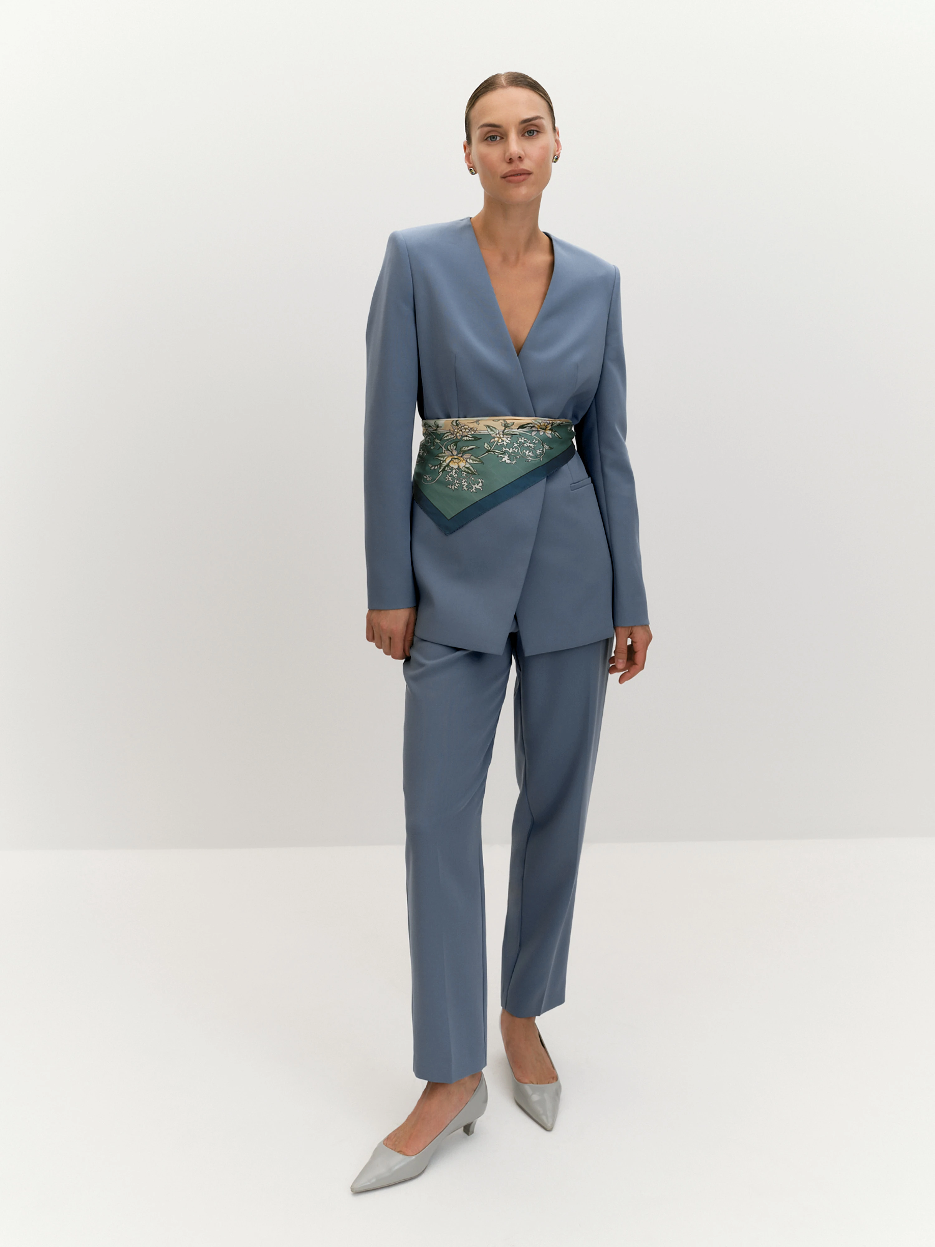 Жакет с уникальным дизайнерским срезом борта визуально вытягивает силуэт. Несмотря на двубортную конструкцию, вторая пуговица скрыта, что создает легкую асимметрию и акцентирует внимание на талии, подчеркивая женственность и изящество фигуры. Легкий акцент на плечи, в сочетании с вертикальными вытачками и рельефами, формирует эффект «песочных часов», что делает жакет особенно привлекательным для создания утонченного силуэта. Боковые карманы с горизонтальным входом не только добавляют функциональности, но и служат стильным акцентом в нижней части изделия, что делает жакет не только красивым, но и практичным. Выбранная ткань обладает отличными эксплуатационными характеристиками. Поливискоза прочная и долговечная, а также обладает хорошей воздухопроницаемостью, что делает пиджак комфортным в носке в течение всего дня. Цвет жакета с говорящим названием «весеннее озеро» идеально подходит для костюма с четким и выверенным кроем. Темно-голубой оттенок символизирует совершенство и осознанность, что делает его универсальным выбором для различных мероприятий — от деловых встреч до вечерних выходов. Такой жакет станет отличным дополнением к гардеробу, позволяя создавать стильные образы и подчеркивая Вашу индивидуальность и вкус.