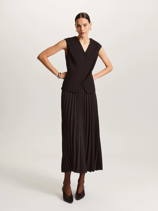 Жилет-безрукавка средней длины. Выбрали для модели привлекательный V-вырез, застежку на пуговицы и дизайнерский срез борта. Дополнили жилет горизонтальными боковыми карманами с листочкой и функциональным хлястиком на спине. Костюмная ткань с вискозой и шерстью, способствует тактильному комфорту и хорошо сохраняет форму. Жилет в приятном шоколадном оттенке будет востребован и как костюмный вариант с брюками TR0613, и соло, в сочетании с другими костюмными тканями или денимом.